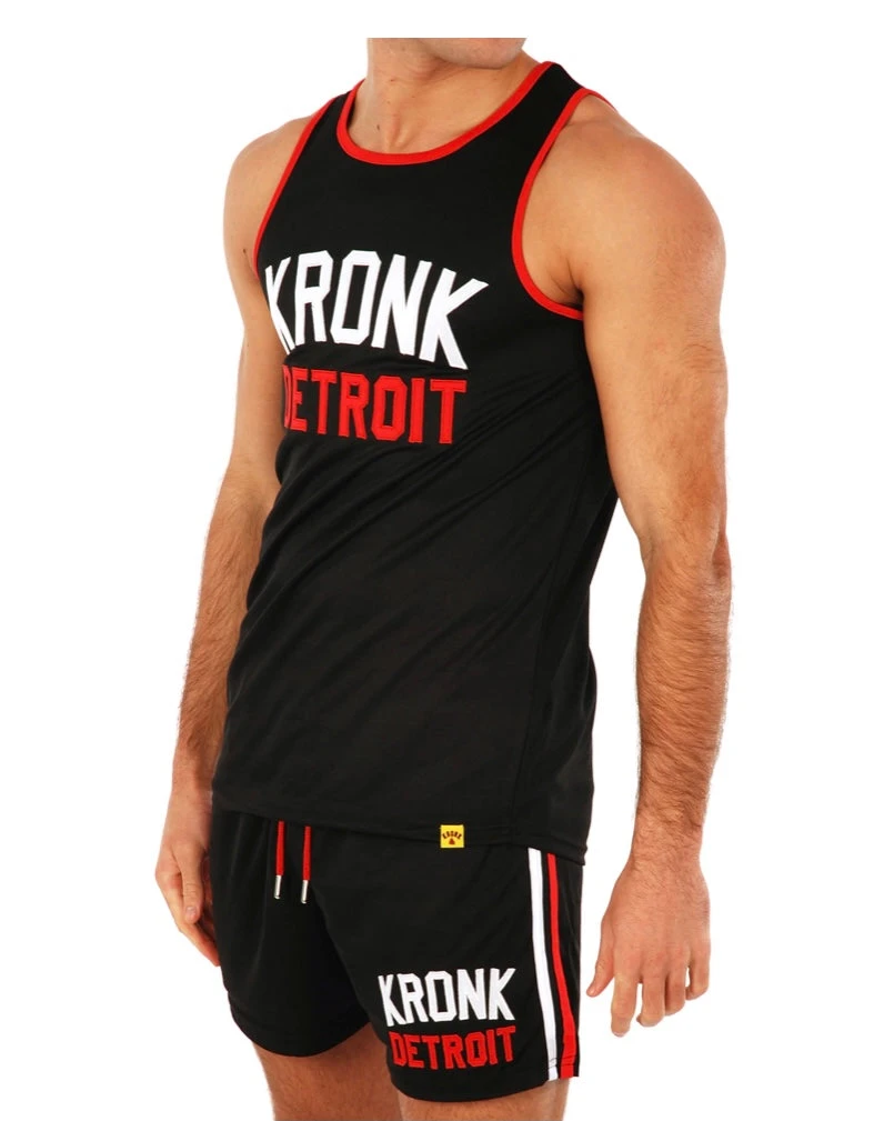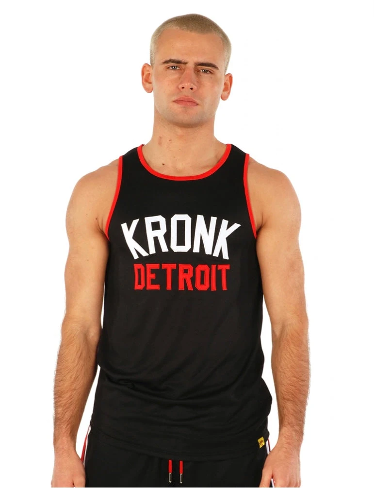 Men’s KRONK Iconic Detroit training gym vest with self fabric applique logo and contrast binding.