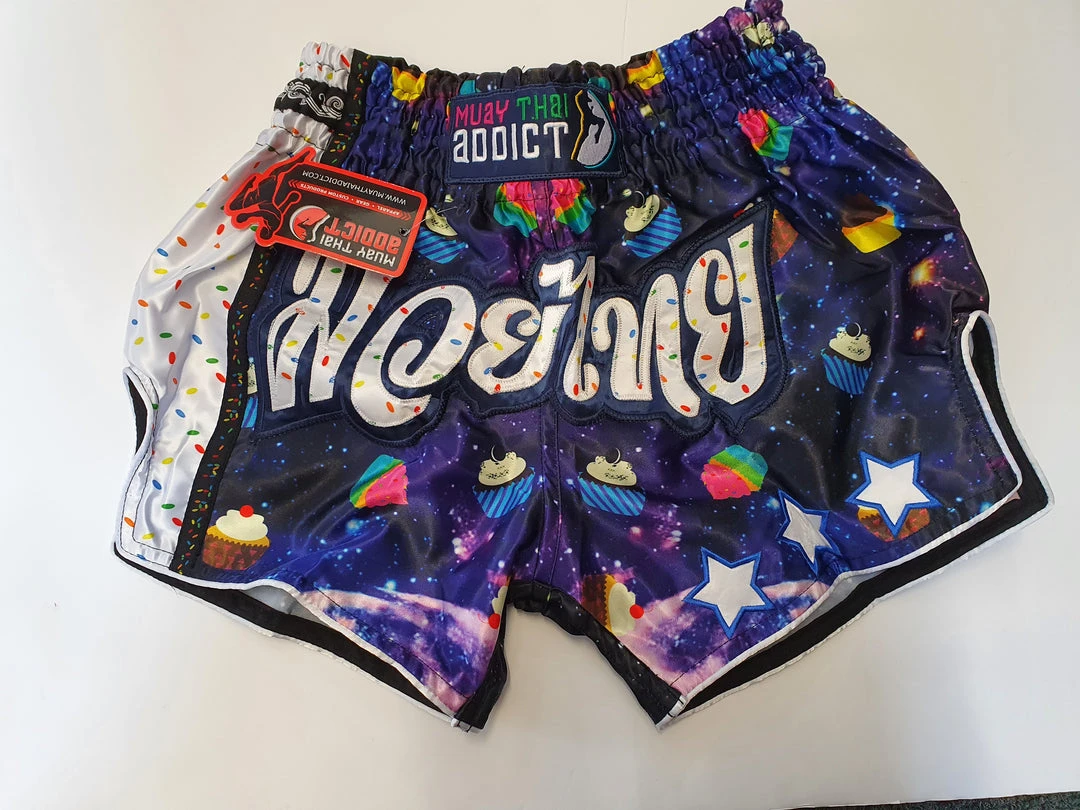 - White and Sprinkles “Muay Thai” on front with dark navy blue border