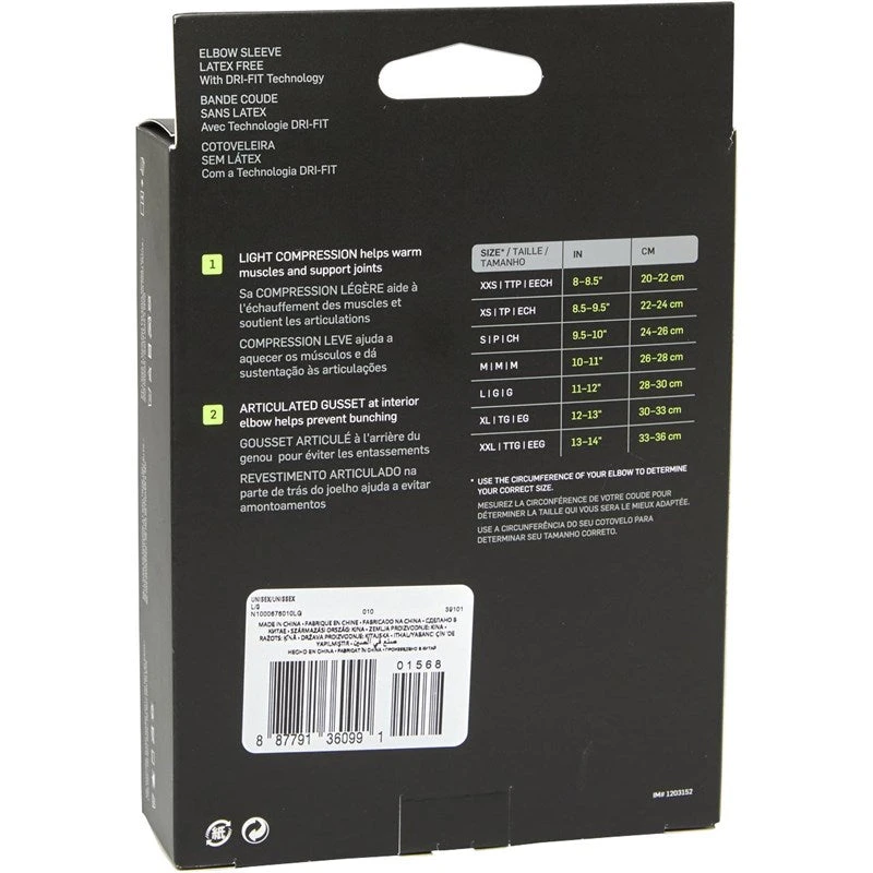 - Nike training elbow sleeve with light compression for joint support and help warp up the muscles while Dri-Fit moisture wicking technology keeps you dry. 0676010