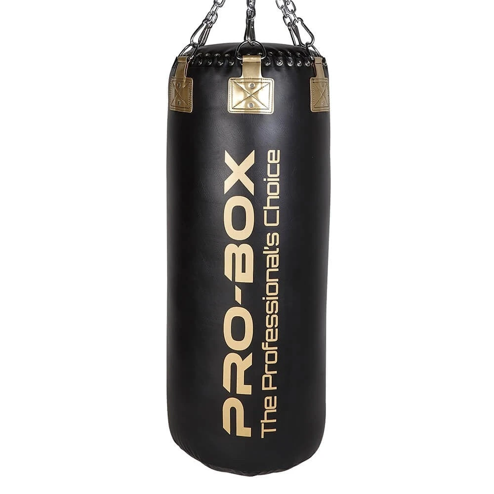 The Pro Box Champ 4ft Jumbo Punch Bag is created from a tough synthetic leather that is textile filled and machine compresed to withstand the heaviest of punches.  The 25mm inner foam jacket provides a softer responsive feel to the punch bag and reduces the impact on your hands and wrists.  Featuring a metal D-ring at the base to allow tethering and therefore less movement to the bag.  (If D-ring is used you should ensure that the strap is loose as it will tighten on impact). Requires Commercial 6 Chain – To be purchased separately.